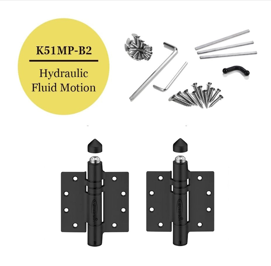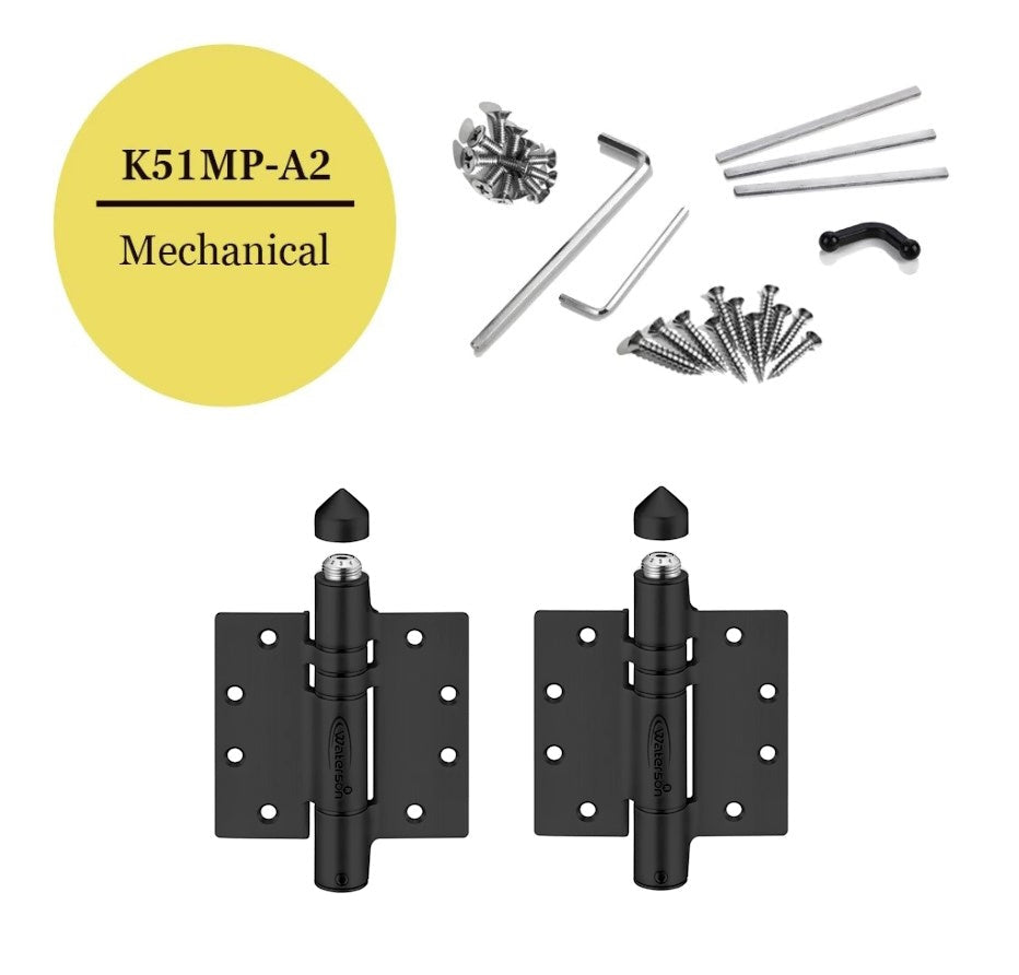 Heavy Duty Self-Closing Gate Spring Hinges offer superior speed control, adjustable power, and tension settings. These butt hinges with weather cap measure 4-1/2" x 4-1/2", have a weight capacity of 150 lbs., and are made of 304 Stainless Steel. They are available in Satin Stainless Steel and Flat Black finishes. There are mechanical or hydraulic hybrid closing types available.