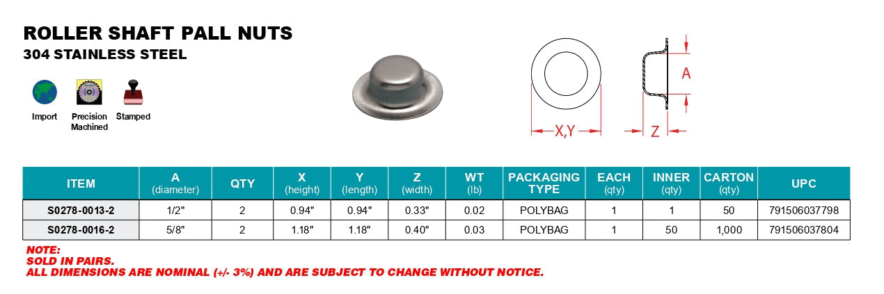 The stainless steel Roller Shaft Pall Nuts are sold in pairs and available in sizes of 1/2″ and 5/8″. The Roller Shaft Pall Nuts are made from grade 304 stainless steel for maximum corrosion resistance and durability. The Pall Nuts are sold in pairs separately from the Roller Shafts.