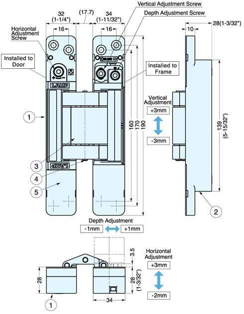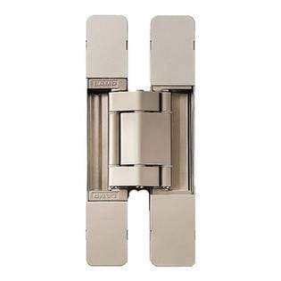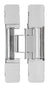 Sugatsune's Heavy Duty Invisible Hinge features vertical, horizontal and depth adjustment after the hinge is installed so you always get a perfect fit. You can hang doors up to 275 lbs. when using 3 hinges. A 2-piece design makes for easy door installation or removal and the included cover caps hide all of the screw heads for a clean, finished appearance. The minimum door thickness is 1-1/2" and the maximum door size is 94-1/2" H x 35-7/16 W. This hinge has successfully passed a 300,000 open and close cycle test.