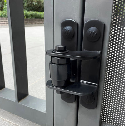 Face Mount BadAss black powder coated bolt-on hinges are finished with a U.V. rated, black matte finish to conveniently make installations quick and easy. Major components are individually coated for complete coverage and washers, nut and bolt have a black oxide finish to match. All provide ½” (12 mm) of horizontal adjustability and attach to fence posts and gate frames with through bolts. Made with maintenance-free sealed ball bearings and tested to over 1 million open/close cycles, these hinges are made to last. The BadAss Powder Coated Face Mount Bolt-On (Opens to 180°) is designed to be used on gates weighing up to 1,100 lb (500 kg).