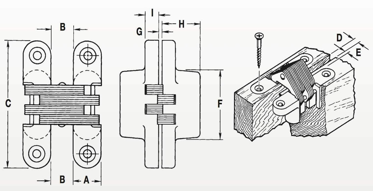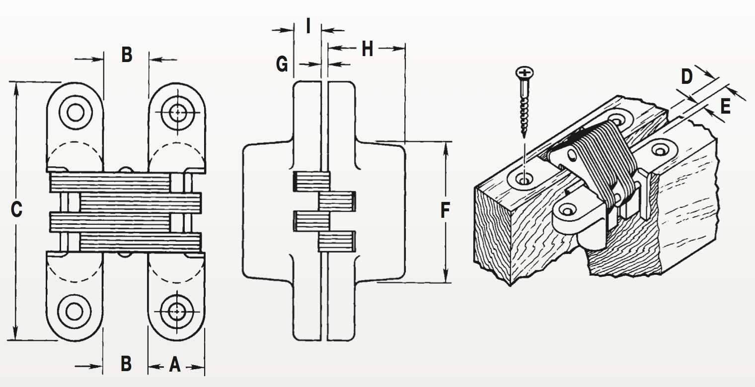 Our High Quality SOSS® Concealed Cabinet Hinge model #101 is for use in wood or metal applications.  These hinges are used where compact size, smooth operation, and flush fit are necessary  SOSS® Concealed Hinges open a full 180° and are a single action hinge.  Multiple Finishes Available!  |