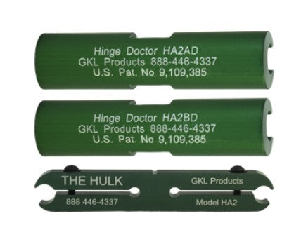 For model HA2 "The Hulk": Simply slip the Hinge Doctor® over the hinge, tighten the Allen head bolt and rotate the Hinge Doctor® toward the door lock. Done! Adjusting the bottom hinge is not recommended.