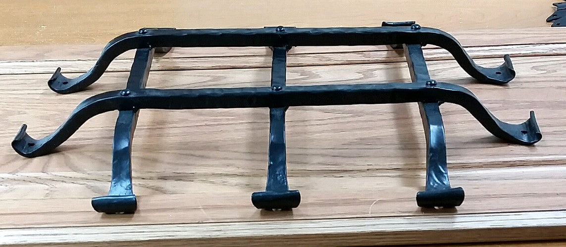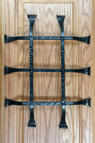 This premium door and gate grille is made of solid hand-forged iron, completely handmade by a skilled blacksmith. It measures 12" x 16" and covers up to 8" x 12" opening. It features curled tips, five bars, and has a black powder coat finish.
