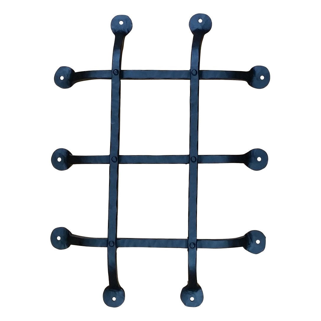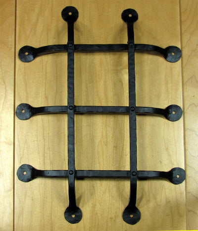 This premium door and gate grille is made of solid hand-forged iron, completely handmade by a skilled blacksmith. It measures 12" x 16" and covers up to 8" x 12" opening. It features flat tips, five bars, and has a black powder coat finish.