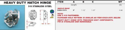 The Heavy Duty Hatch Hinge is easily installed using #10 fasteners and features a removable pin. This hatch hinge is precision cast and made from grade 316 stainless steel for maximum corrosion resistance and durability.