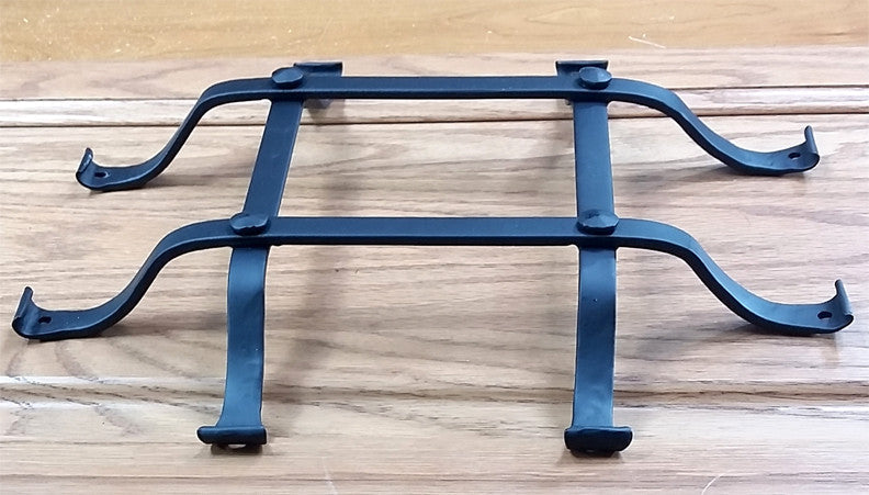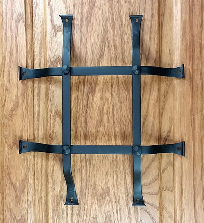 This standard style door and gate grille is made of hand-forged iron, completely handmade by a skilled blacksmith. It measures 10" x 12" and covers up to 7" x 9" opening. It features curled tips, four bars, flared mounting legs, and has a black powder coat finish.