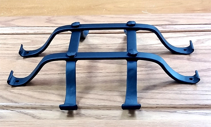 This standard style door and gate grille is made of hand-forged iron, completely handmade by a skilled blacksmith. It measures 8" x 10" and covers up to 5" x 7" opening. It features curled tips, four bars, flared mounting legs, and has a black powder coat finish.